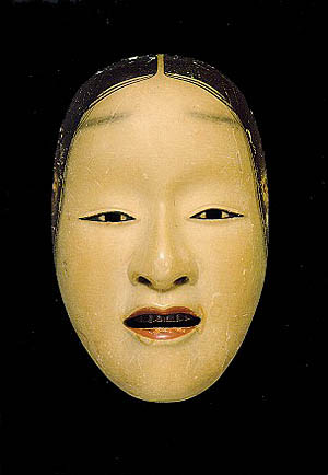 Zô no Onna: A slightly older woman (in her twenties) as indicated by the thinner face. This mask is considered suitable for female roles which call for elegant refinement. It is used for aristocratic women who have a streak of cruelty, such as Rokujô in Nonomiya, the ghost of Lady Yang Gue Fei in Yokihi, or the aristocratic woman who spurns the love of a lowly worker in The Burden of Love. It is also used for supernatural women such as the Heavenly Maiden in Hagoromo (The Feather Mantle). In the picture to the right below, the Heavenly Maiden, having gotten her feather robe back from the fisherman who took it, wears it as she dances in gratitude. Her heavenly nature is indicated by the elaborate phoenix headress she wears. The woman on the left is the ghost of the Lady Yang Gue Fei (Yokihi in Japanese), gazing at a hair ornament the emperor of China has given her as a memento..