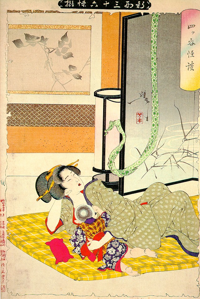 Yotsuya Ghost Story (Yotsuya Kaidan): A woodblock print by Yoshitoshi ("36 Ghosts" series) of a scene from the Kabuki play by Tsuruya Nanboku IV, first performed in 1825. This image might be thought of as prelude to the play. Oiwa, the beautiful wife of a masterless samurai named Iemon (or Iyemon), lies on a futon nursing her infant son in the summer heat. Oiwa has never quite recovered from childbirth and so is something of an invalid. Her husband has been reduced to make a living by producing oilpaper umbrellas and is deeply resentful of the fact that in her weakened condition she cannot help support the family. The stage is set for temptation in the form of a neighbor who is a rich doctor. This neighbor has a granddaughter who has fallen in love with Iemon and wants to marry him. The temptation of a rich wife is too much for Iemon, and he agrees to accept some "medicine" to give Oiwa which will supposedly strengthen her, but actually is meant to poison her.