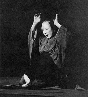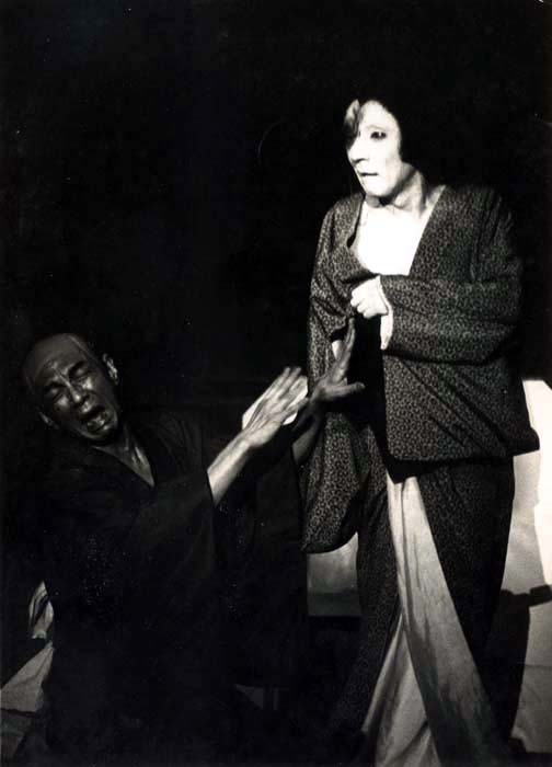 A different production. Takuetsu, the masseur, attempts to keep Oiwa from leaving by holding her back with a standing screen, but in his horror at her changed appearance he falls back and the screen falls over. Oiwa is holding a shock of her own hair, which has fallen out as she combed it in preparation for her visit to the doctor's. In her increasing fury she unconsciously wrings it and blood drips onto the screen below.