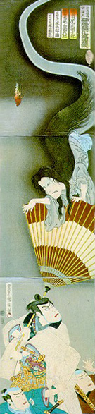 Here Okiku sweeps down from above on her former master, pulling his umbrella inside out. This movement downward probably refers to one version of the story, in which Aoyama hung Okiku upside down above the well, asking her one last time if she'd become his mistress. When she refused, he let her fall to her death. Note her snake-like body and the "tama" fire hovering in the air nearby.