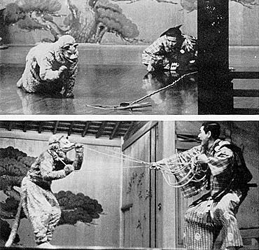 Having changed back into a fox, he returns to try to get the bait from the snare. The trapper has reset the trap, and is waiting for him hidden behind a pine tree. The trapper catches him, but at the last minute the fox slips out of the noose and escapes.