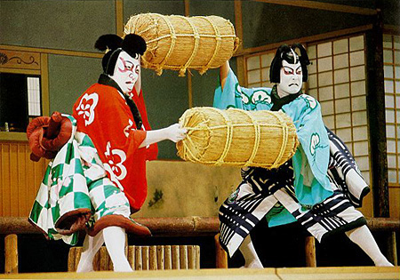 In the Kabuki version of the fight between Umeo (left) and Matsuo (right), they pause to strike a pose with rice bales. Can you tell which is the good guy here, just from the makeup?