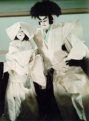Matsuomaru and his wife Chiyo remove their outer robes to reveal white robes of mourning for their son Kotaro, as they prepare to accompany his body to the burial site: