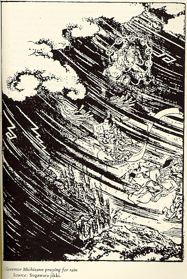 In 888, while Michizane was the Governor of Sanuki Province, there was a severe drought. Michizane first performed Buddhist rituals and wrote Chinese poems in an attempt to bring the rain back. The following excerpt is from Michizane's introduction to a poem on the subject :