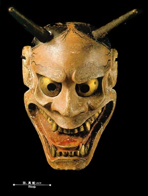 Shinja (True Snake): The most horrific and powerful of the serpent-woman masks. Very little is left of her humanity. The following description from the Taiheiki of a beautiful woman transforming into a demon fits this mask very well: "her eyes become like two pools of molten vermillion, flowing on the surface of a mirror; her upper and lower fangs protrude and cross, and the edges of her mouth split wide open, reaching from ear to ear; the eyebrows that obscure her forehead look as though they've been dipped in lacquer at least a 100 times, and two calf horns, grown over with scales, sprout out from under her parted hair."