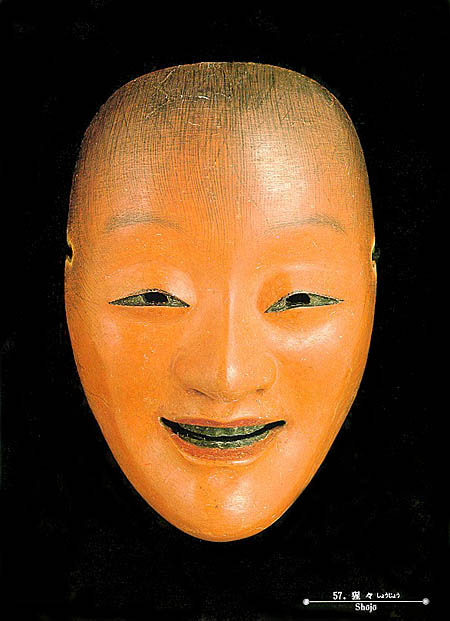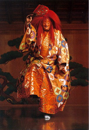 Here the sake sprite performs a dance celebrating the joys of drinking. His wild red hair indicates his untamed nature; the bright oranges, reds, and golds of his costume help accentuate his happy, alcohol-induced glow.