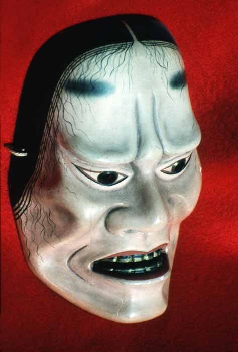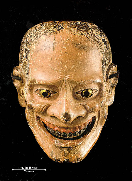 Yamamba (Mountain Hag): part demon, part mountain deity, part earth mother goddess, Yamamba is a very ambiguous figure. In the Noh play Yamamba, she complains that she is feared by human beings, yet has secretly helped them in their various labors. The mask expresses this ambiguity, combining elements of supernatural power (the golden eyes) with a rather realistic portrayal of a powerful older woman. Compare the modern Yamamba mask below: