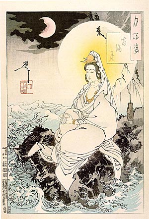 The Bodhisattva Kannon listening for the cries and prayers of sailors. Woodblock print by Yoshitoshi from the series, "One Hundred Views of the Moon."